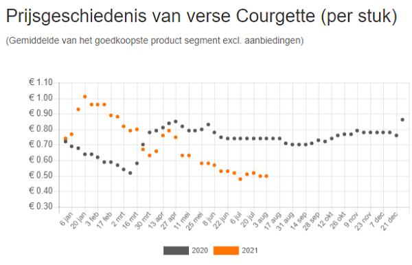 De prijstrend van courgette is dalend maar stabiliseerde in de laatste weken rond de 50 eurocent. De prijzen van courgette lagen in begin dit jaar nog flink hoger dan in 2020, lagen tussen eind maart en eind april gemiddeld ongeveer op hetzelfde niveau, na 27 april 2021 is er een groot prijsverschil ontstaan. Courgette kost deze week gemiddeld 0,50 eurocent terwijl de prijs vorig jaar 0,74 euro bedroeg.