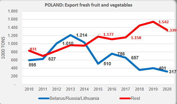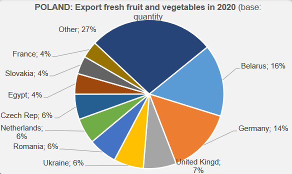 Voorheen was Rusland een enorm belangrijke afzetmarkt voor Polen. Op het hoogtepunt in 2013 kon Polen 1,2 miljoen ton verse groenten en fruit naar Rusland (incl. Wit-Rusland en Litouwen) exporteren. Vorig jaar was dat nog maar 317.00 ton. Hierbij was Wit-Rusland nog belangrijk met een export van 262.000 ton. Duitsland is de 2de afnemer van Pools product met in 2020 een hoeveelheid van 240.000 ton. Dat was meer dan in 2019 maar minder dan in 2018. Het Verenigd Koninkrijk was de derde afnemer met in het afgelopen jaar een hoeveelheid van 120.000 ton. Dat was beduidend minder dan in de jaren ervoor. In het begin van dit jaar krabbelde de export naar het Verenigd Koninkrijk iets op. Dan volgen Oekraïne en Roemenië en vervolgens Nederland. De export naar Nederland schommelt de laatste jaren tussen de 75 en de 110.000 ton. Opvallend is dat uien het belangrijkste product is dat naar Nederland gaat.