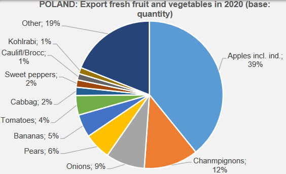 De Poolse export drijft vooral op appelen. Met 645.000 ton vertegenwoordigt dit product bijna 40% van de totale export van verse groenten en fruit. Na Wit-Rusland is Egypte de tweede afnemer van Poolse appelen. In 2020 ging het om 75.000 ton en in 2019 zelfs om bijna 130.000 ton.