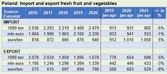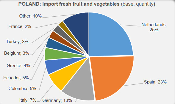 In totaal komt een kwart van de totale Poolse import uit/via Nederland, ofwel en hoeveelheid van 610.000 ton. Volgens KCB/GFH zou er vorig jaar 130.000 ton in Nederland geteelde verse groenten en fruit naar Polen zijn uitgevoerd. De import uit Spanje, de 2de leverancier, had vorig jaar een omvang van 576.000 ton. Dat was minder