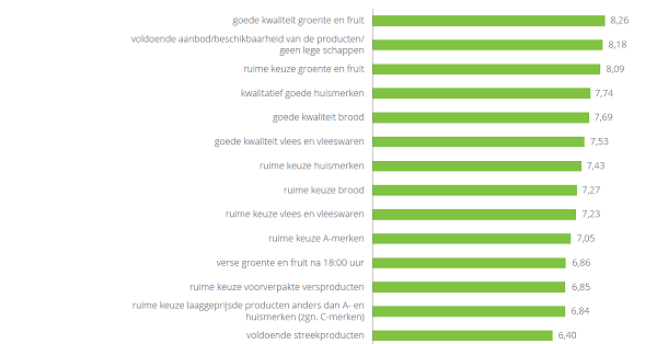 Het belangrijkste aspect van een goede supermarkt blijft volgens de respondenten de prijs. Daarna is de afstand van huis tot de winkel het meest belangrijk. De belangrijkste aspecten (na prijs en afstand) zijn verse producten en ruime keuze op de groente- en fruitafdeling, weinig uitverkochte artikelen, vriendelijk personeel, kwalitatief goede huismerk producten en gratis parkeergelegenheid.