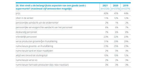 Ten opzichte van 2019, vinden de respondenten de ruime keuze en kwaliteit van verse vis, kwaliteit van groente en fruit, ruime keuze duurzame producten, voldoende aanbod van producten en voldoende streekproducten nu significant meer belangrijk. De ruime keuze van branchevreemde producten is minder belangrijk dan de vorige twee jaar.