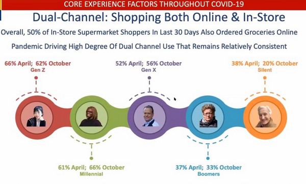 "Vorig jaar meldde 50% van de shoppers dat ze de laatste 30 dagen zowel in de winkel als online hadden gewinkeld. De pandemie was de drijvende kracht achter een hoge mate van dual channel-gebruik en ondanks generatieverschillen gebeurde dit over de hele linie," zegt Numainville. "In het verleden werden deze gescheiden; of je was een online shopper of een in-person shopper."