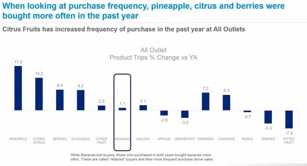 Tegelijkertijd verloren andere fruitsoorten zoals sinaasappelen, appelen, druiven en peren kopers. Naarmate we als samenleving ouder worden, zal het voor sommige van deze fruitsoorten een kritiek probleem worden dat ze geen nieuwe kopers uit jongere huishoudens vinden," aldus Parker.
