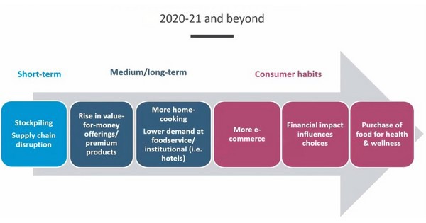 Wat betreft consumentengewoonten die waarschijnlijk zullen blijven bestaan, zal e-commerce blijven bestaan omdat zoveel mensen het gemak van het gebruik ervan hebben ervaren. De financiële gevolgen van de pandemie zullen keuzes blijven beïnvloeden in de vorm van ofwel een terugkeer naar foodservice ofwel een toenemend gebruik van goedkope merken. "En de aankoop van voeding voor gezondheid en welzijn zal waarschijnlijk doorgaan."