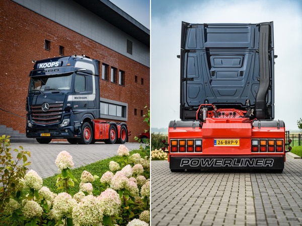 Over de truck vertelt Dimitri van Dongen, Key Accountmanager bij Mercedes-Benz Trucks Nederland: "Deze Powerliner hint naar de illustere Actros-voorganger, de Mercedes-Benz SK, ofwel Schwere Klasse. Dankzij meer dan 30 jaar ontwikkelen en innoveren, is deze Powerliner een compleet andere truck dan de Powerliner die we tot nu toe kenden. Zoals alle trucks van Wolter Koops is ook deze Actros uitgerust met de nieuwste veiligheidssystemen, zoals MirrorCam en Active Brake Assist 5." Marco Boere vult aan: "Qua uitstraling is er bij deze uitvoering nog een schepje bovenop gedaan, met metallic lak en een verlengde zonneklep met led-verstralers, de achterzijde volledig bekleed met traanplaat en een Deense achterbumper met dynamische verlichting. Een herkenbare Wolter Koops truck, maar met een unieke uitstraling."