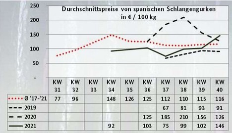 Daarop werden ook de Spaanse komkommers vervolgens duurder. Bij de snackkomkommers domineerden Duitse en Nederlandse leveringen de markt. Inmiddels arriveerden in Frankfurt en München ook komkommers uit Spanje. Turkse en Griekse aanvoer completeerde het aanbod. De prijzen trokken vaak licht aan vanwege een goede vraag.