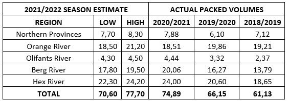 De Zuid-Afrikaanse tafeldruivenindustrie (SATI) heeft de eerste raming van de oogst voor het seizoen 2021/2022 bekendgemaakt, waarbij de geraamde volumes over het algemeen vergelijkbaar zijn met de cijfers van het vorige seizoen. SATI raamt een innamevolume tussen 70,6 miljoen en 77,7 miljoen kartons (4,5 kg equivalent), met een middenpunt op 74,2 miljoen kartons, wat dicht aanleunt bij het volume verpakt tijdens het seizoen 2020/2021.