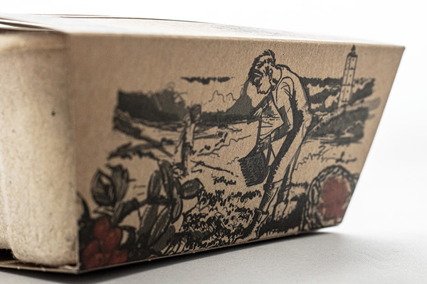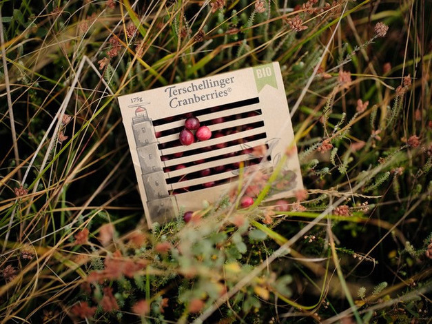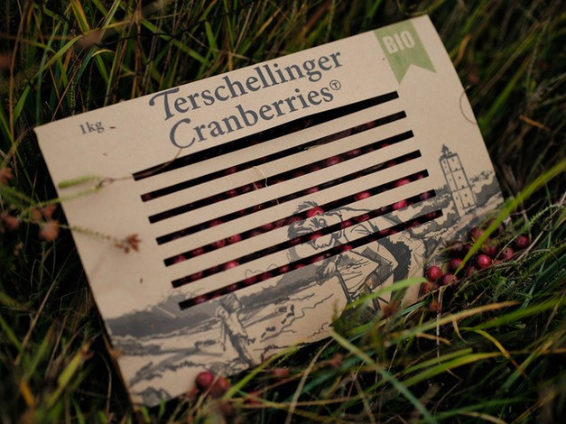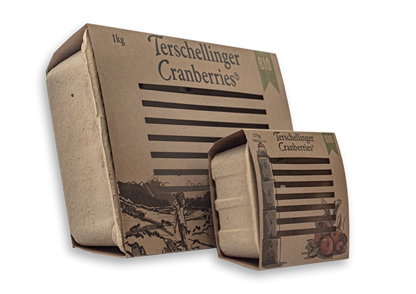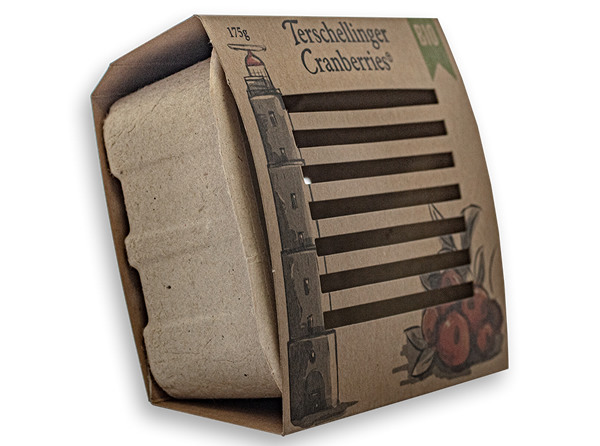 Er is een grafisch design ontwikkeld waarin je wordt meegenomen naar de oogst van de cranberries. Ook de kenmerkende vuurtoren van Terschelling zie je terug in het ontwerp. De zwart met rode bedrukking combineert erg goed met het bruine gerecyclede karton en met het pulpbakje. Het resultaat is een passend geheel met een natuurlijke uitstraling die perfect past bij het merk.