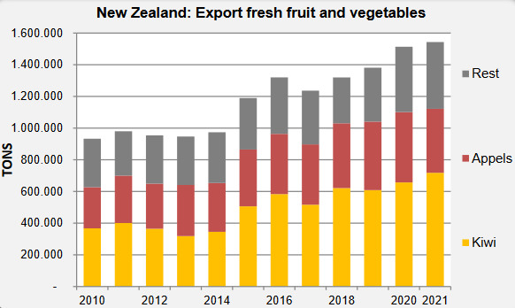In hoeveelheid gezien zal de Nieuw-Zeelandse export van verse groenten en fruit dit jaar 2% groter worden dan in 2020. In totaal gaat het om 1,54 miljoen ton, een nieuw record. Deze stijging is geheel