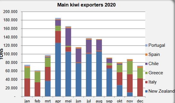 90.000 ton in 2020. Bij de export naar EU-landen gaat het nog steeds meer om groene dan om gele kiwi's. De laatste 3 jaar werd er steeds ca. 140.000 ton aan groene kiwi’s naar de EU verscheept.