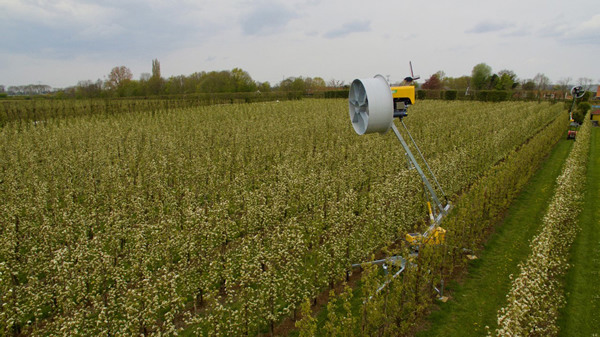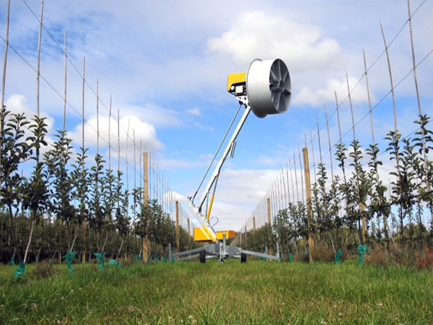 "Zo kwamen we uit bij de windmachine van FrostFans. Deze werkt volgens het principe waarbij de warme lucht uit de inversielaag naar beneden wordt getrokken en zich vermengt met koude lucht aan de grond. Daarnaast zorgt de continue wind ervoor dat de vorst zich niet hecht op het gewas. Doordat de propeller direct aangedreven wordt en er druk wordt gecreëerd is een relatief kleine motor voldoende om enorme luchtverplaatsing te creëren om het fruit te beschermen."