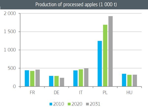 Tot 2031 zal de productie van bewerkte appelproducten in Frankrijk, Italië en Polen naar verwachting stijgen van 0,5% naar 1,2% per jaar. In Hongarije zal de productie licht toenemen met 0,2% per jaar.