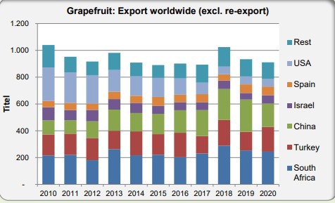 Zuid-Afrika is ’s werelds grootste grapefruitexporteur met jaarlijks een export van rond de 0,25 miljoen ton. Turkije en China zijn de andere grote exportlanden. Nederland komt op de vierde plaats. Vanzelf-sprekend gaat het hierbij om re-export. Andere middelgrote “echte” exportlanden zijn Israël, Spanje en de Verenigde Staten.