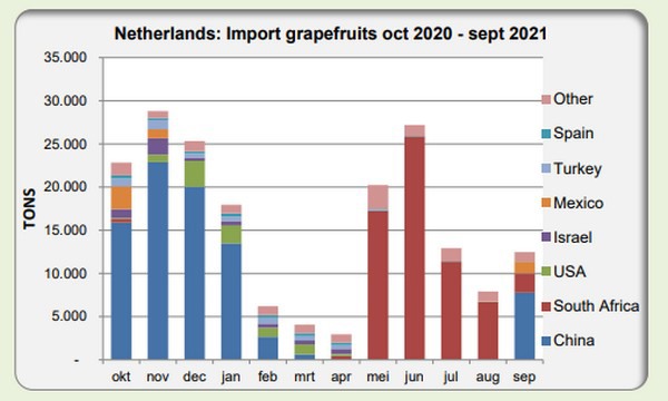 beide aan de markt, maar verder levert China van oktober t/m begin februari en Zuid-Afrikaanse grapefruit komt in Nederland aan van mei tot begin september. Naast de beide grote leveranciers importeert Nederland ook grapefruit uit de Verenigde Staten, Israël, Turkije, Spanje, Zimbabwe en Swaziland.