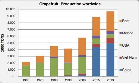 De grote productiegroei is dan ook voornamelijk toe te schrijven aan de groei in China. Volgens de FAO is de productie van vooral Chinese pomelo’s gegroeid van nog geen 0,2 miljoen ton rond de eeuwwisseling naar bijna 5 miljoen ton. In diezelfde periode daalde de productie in de Verenigde Staten van 2,5 naar 0,5 miljoen ton. Na China is Vietnam inmiddels de tweede grapefruit (pomelo) producent met 0,8 miljoen ton. Dan volgen Mexico (0,5 miljoen ton) en Zuid- Afrika (0,4), aldus Jan Kees Boon van Fruit & Vegetable Facts.