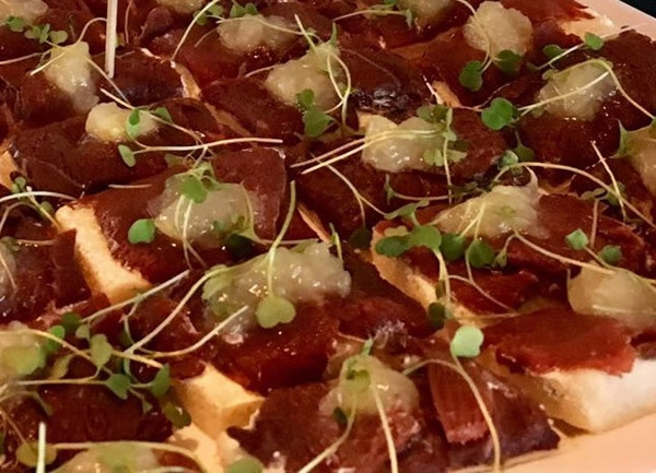 Crostini koud gerookte ganzenborstfilet met Conference-peergelei en cress