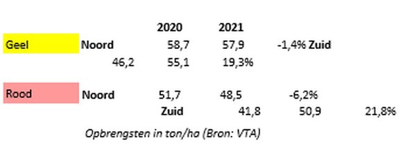De gemiddelde opbrengst van alle ingestuurde resultaten is 55,4 ton/ha. Dit is 2,8 ton hoger dan vorig seizoen. Dit komt met name door de hogere opbrengsten onder de rivieren. Vorig jaar lagen de opbrengsten hier gemiddeld op 46,5 ton/ha, terwijl deze dit jaar op 54,6 ton/ha zit. In het noorden liggen de opbrengsten wel iets lager t.o.v. vorig seizoen. Dit jaar is de gemiddelde opbrengst daar 56,1 ton/ha, terwijl deze vorig seizoen 57,3 ton/ha was.