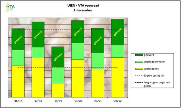 In absolute tonnen is er bij de VTA-leden 15,5% meer voorraad dan het 5-jarig gemiddelde, terwijl ook de vrije voorraad hoger ligt. Maar daarbij moet worden opgemerkt dat het 5-jariggemiddelde sterk omlaag wordt gehaald door het droge seizoen 2018/2019. In vergelijking met vorig jaar zit er nog wel wat meer voorraad, maar gelet op de lange termijn ligt de totale voorraad een beetje op een vergelijkbaar niveau met de seizoenen 2017/2018 en 2019/2020.