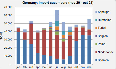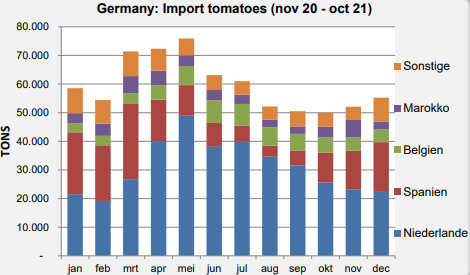 Bij de import uit Nederland gaat het om zowel in Nederland geteeld product als om re-export. In principe gaat het Duitse Statistische Bundesambt bij import uit van waar het product geteeld is. Eurostat cijfers gaan import in Duitsland gaan uit van waar het product in laatste instantie vandaan komt. Beide bronnen geven voor Nederland in 2021 een kleinere import van verse groenten en fruit dan in 2020.