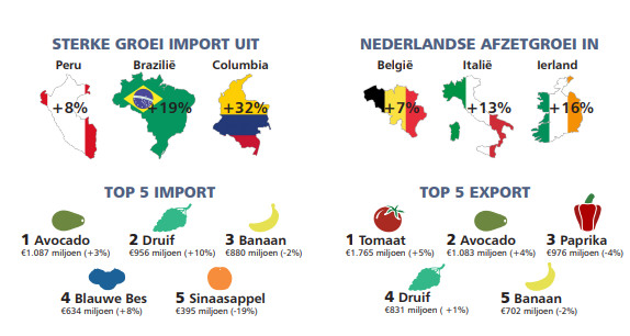 De top-3 herkomstlanden van verse groenten en fruit zijn Spanje, Peru en Zuid-Afrika. Vooral de import uit Peru stijgt flink door. In de periode van 2016 tot en met 2021 is de import uit Peru meer dan verdubbeld naar €1,1 miljard. De hoofdproducten uit Peru zijn avocado, blauwe bes en mango. De grootste groeiers van de Nederlandse import van fruit zijn Brazilië (+19%) en Columbia (+32%).