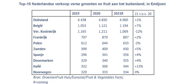 Het grootste deel van alle verhandelde groenten en fruit gaat naar onze buurlanden, 95 procent blijft in Europa. De Nederlandse telers en handelsbedrijven zijn partners voor de Europese retail en foodservice voor het totale assortiment van groenten en fruit. Duitsland (€4,9 miljard) is de belangrijkste afzetmarkt, gevolgd door België (€1,2 miljard) en het Verenigd Koninkrijk (VK) (€1,1 miljard. De verkoop van verse groenten en fruit aan klanten in België nam met 7 procent toe en de export naar het VK daalde met 12 procent ten opzichte van 2020.