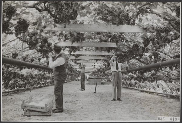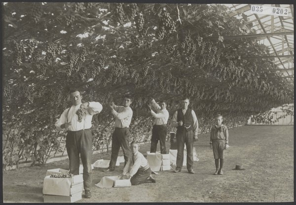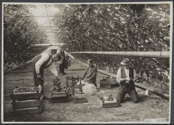 Oogsten van druiven in een kas in het Westland, oktober 1919