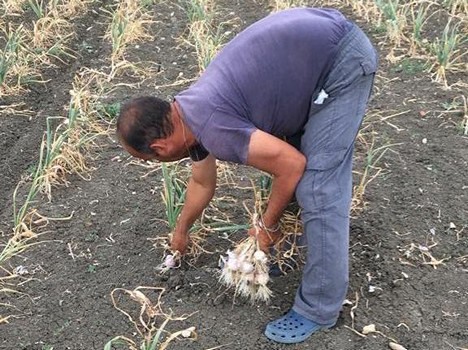 Gianni Manuguerra, voorzitter van de telersvereniging, aan het werk op een perceel knoflook