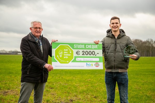 Thijs Brooijmans (21), bachelor student aan de HAS Hogeschool in Den Bosch, is de eerste winnaar geworden van de Adri den Dekker Prijs die vorig jaar in het leven werd geroepen door groentefabrikant HAK in nauwe samenwerking met de HAS Hogeschool in Den Bosch en Venlo. De student, derde generatie van een familie van akkerbouwers in Steenbergen, ging er met de stimuleringsprijs vandoor met zijn winnende essay genaamd 'Strokenteelt is de toekomst; in tegenstelling tot de huidige monocultuur, een weerbaar teeltsysteem'. Aan de prijs is ook een studiecheque van € 2000 verbonden.