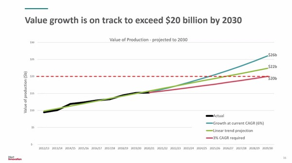 De tuinbouwsector ligt ook op schema om tegen 2030 een omzet van € 13 miljard te bereiken. De huidige groeipercentages wijzen er zelfs op dat dit cijfer al in 2025-26 zou kunnen worden behaald. De National Farmers Federation mikt op een omzet van € 65 miljard in 2030 voor de hele landbouwsector, waarbij de tuinbouw een van de snelstgroeiende sectoren is.