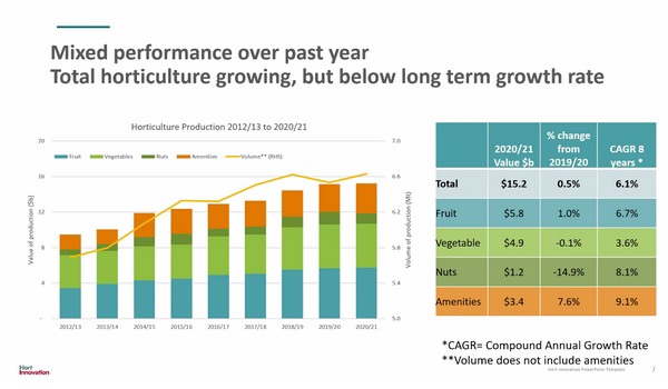 "De trend is duidelijk: groei", zei Briggs kort en krachtig. "De groei bedraagt ruim 11% per jaar. Dubbele groeicijfers zijn fenomenaal in de land- en tuinbouwsector, dat kan elke expert beamen. De omzet nam niet zoveel toe in de afgelopen twaalf maanden, maar de sector had dan ook te maken met aanzienlijke tegenwind op het gebied van logistiek, marktprijzen en zelfs politieke druk. Dat heeft allemaal een impact op het vermogen om het product op de markt te brengen. Toch ligt er een stevig fundament voor de Australische tuinbouwproducten op onze exportmarkten. We hebben een product dat veel mensen willen, en het is bemoedigend om dat weerspiegeld te zien in de groeicijfers op lange termijn."