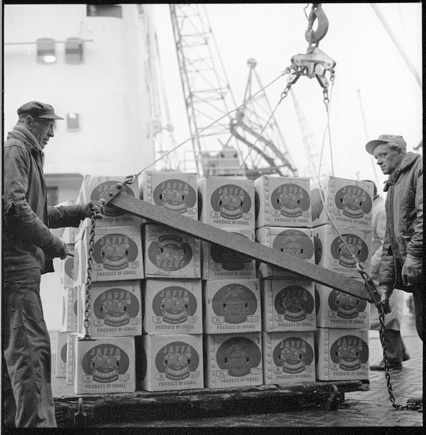 Havenwerkers lossen in januari 1965 aan de Merwehaven dozen met sinaasappels van het schip Lemoncore. (Coll. Ary Groeneveld)