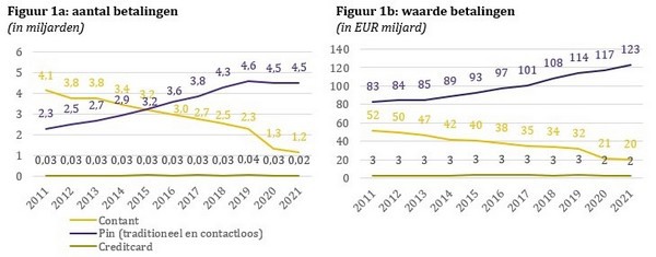 In 2021 hebben consumenten in Nederland iets minder betalingen aan de kassa gedaan dan in 2020. Deze daling is deels het gevolg van de langere lockdowns om de Covid-19 pandemie te bestrijden in 2021. In dat jaar hebben consumenten bijna 1,2 miljard aankopen gedaan met contant geld, ten opzichte van 1,3 miljard contante aankopen in 2020, een afname van bijna 11%. Het aantal pinbetalingen lag in 2021 op 4,5 miljard, en is daarmee vrijwel gelijk aan het aantal pinbetalingen in 2020. Hierdoor daalde het aandeel van alle betalingen aan de kassa dat contant werd afgerekend van gemiddeld 22% in 2020 naar 20% in 2021. Voorafgaand aan de pandemie werd overigens nog 30% van de aankopen aan de kassa met contant geld voldaan.