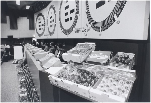 Muzikale veiling op 9 april 1996 met medewerking van de band De Kromme Jongens in de groenteveiling Westland Noord aan de Nieuweweg in Poeldijk (Westlands fotobureau)