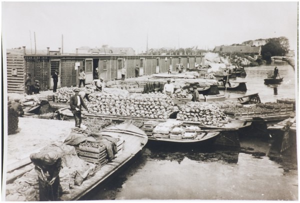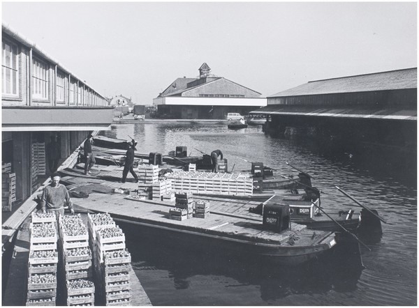 Groente- en fruitveiling Poeldijk aan de Monsterseweg in Poeldijk. In het water schuiten/Westlanders met tuinbouwproducten (Historisch Archief Westland 1955)