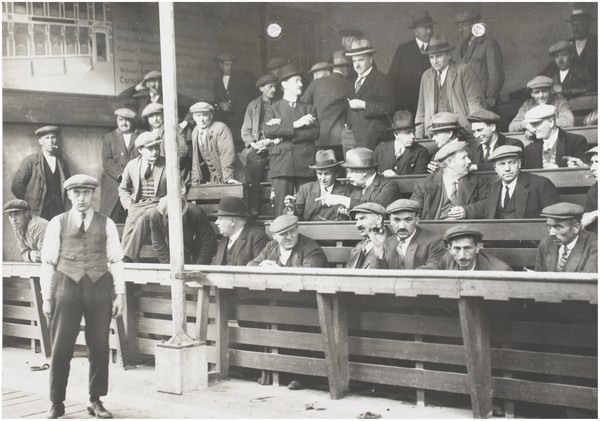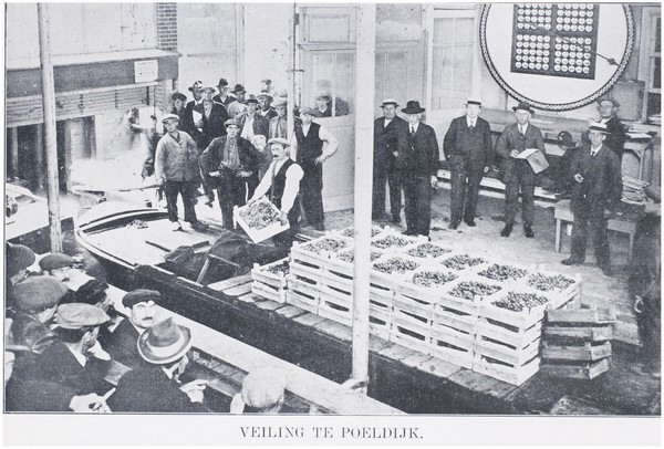 Interieur van de koophal van de groente- en fruitveiling Poeldijk aan de Monsterseweg in Poeldijk. De koopwaar ging per westlander door de veiling heen, langs de klok (Historisch Archief Westland 1929)