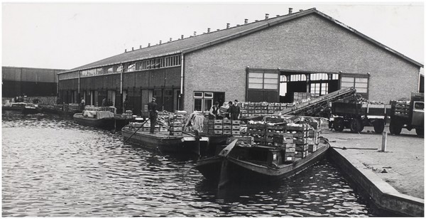 Aan- en afvoer van goederen bij de groente- en fruitveiling Poeldijk aan de Nieuweweg in Poeldijk door schuiten en vrachtwagens (Historisch Archief Westland 1955)