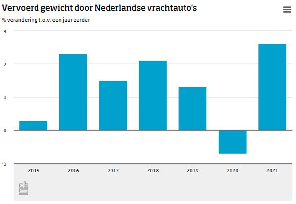 De hoeveelheid goederen die vanuit het buitenland naar Nederland werd vervoerd nam in 2021 ook iets toe, met 0,9 procent.