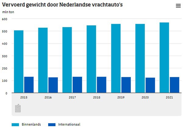 Nederlandse vrachtauto’s vervoerden 572 miljoen ton goederen, 81,5 procent, binnen Nederland. Het binnen Nederland vervoerde gewicht steeg in 2021 met 2,4 procent ten opzichte van een jaar eerder. Na een lichte daling in 2020 steeg het binnenlands vervoer naar het hoogste niveau ooit. Het internationaal over de weg vervoerde gewicht steeg van 125 miljoen ton in 2020 naar bijna 130 miljoen ton in 2021, een toename van 3,5 procent.