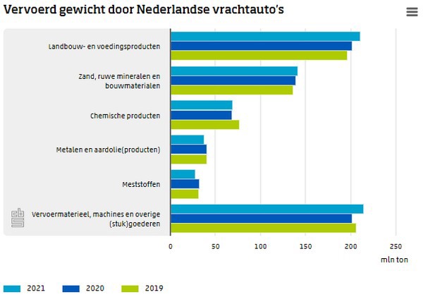Landbouw- en voedingsproducten maken 30,0 procent uit van het door Nederlandse vrachtauto’s vervoerde gewicht. Het vervoer van deze goederen steeg in 2021 met 4,4 procent ten opzichte van een jaar eerder. Het vervoer van zand, ruwe mineralen en bouwmaterialen, goed voor een vijfde van alle vervoerde goederen, steeg 1,2 procent. Het vervoer van vervoermaterieel, machines en overige (stuk)goederen nam toe met 6,5 procent en maakt 30,6 procent uit van het totaal.