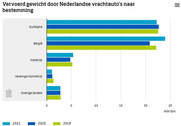 Het grensoverschrijdend vervoerd gewicht vanuit en naar Nederland steeg in 2021 met 3,7 procent in vergelijking met een jaar eerder. Deze stijging werd bijna geheel veroorzaakt door het vervoer vanuit Nederland naar het buitenland (6,2 procent). Het vervoerde gewicht naar Frankrijk steeg met 11,8 procent en naar België met 14,7 procent. Dat maakte in 2021 België in plaats van Duitsland de belangrijkste buitenlandse bestemming van Nederlandse vrachtauto’s. Het vervoerde gewicht naar Duitsland bleef in 2021 vrijwel gelijk. Het door Nederlandse vrachtauto’s vervoerde gewicht naar het Verenigd Koninkrijk daalde verder, met 8,6 procent.