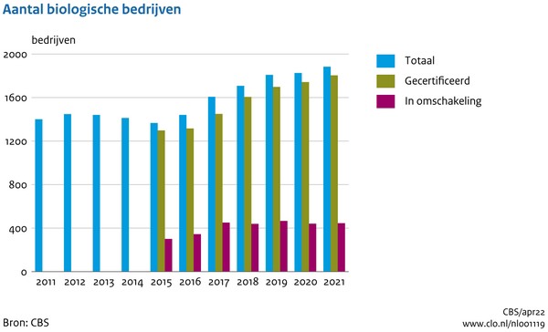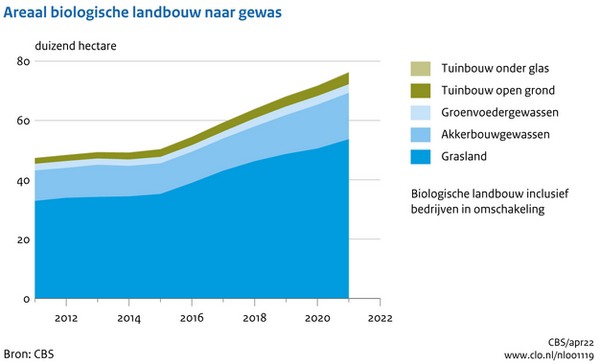 Tussen 2011 en 2021 is het areaal biologische landbouw met 61 procent gegroeid van 47.000 naar 76.000 hectare. De groei vindt vooral plaats in het areaal tuinbouw open grond (plus 108 procent), tuinbouw onder glas (93 procent) en grasland (plus 63 procent). In 2021 is het biologisch landbouwareaal 5 procent groter dan in het jaar ervoor. In 2021 bestaat het biologisch landbouwareaal voor 54 duizend hectare uit grasland, voor 16.000 hectare uit akkerbouwgrond, voor 4.000 hectare uit tuinbouw (open grond), uit 3.000 hectare grond met groenvoedergewassen en 227 hectare tuinbouw (onder glas). Het betreft hier de areaalgroottes van zowel gecertificeerd biologische bedrijven als ook bedrijven die in omschakeling zijn.