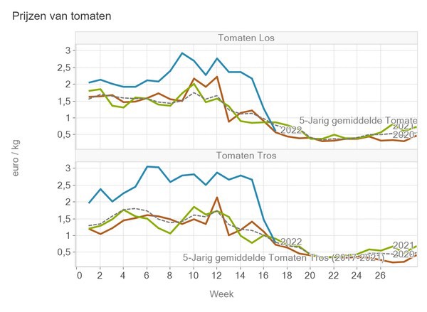 De prijs voor losse tomaten ging in week 17 door de helft, zoals dat eerder al het geval was voor trostomaten. De kiloprijs voor losse tomaten komt over week 17 uit op net iets meer dan 61 eurocent. De middenprijs voor trostomaten ligt hoger, maar met ruim 78 eurocent ook onder het vijfjarig gemiddelde. Met name in trostomaat ligt het volume nog altijd fors lager dan vorig jaar.