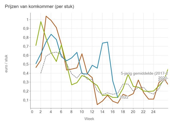 De middenprijs voor komkommer ging ook opnieuw door de helft. Over heel week 17 blijft er gemiddeld een stuksprijs van net geen 13 eurocent over. Ook hier een prijs die ondergemiddeld is, al leert een blik op de cijfers van de afgelopen jaren dat doorgaans vanaf week 18 de prijzen ook weer iets oplopen.