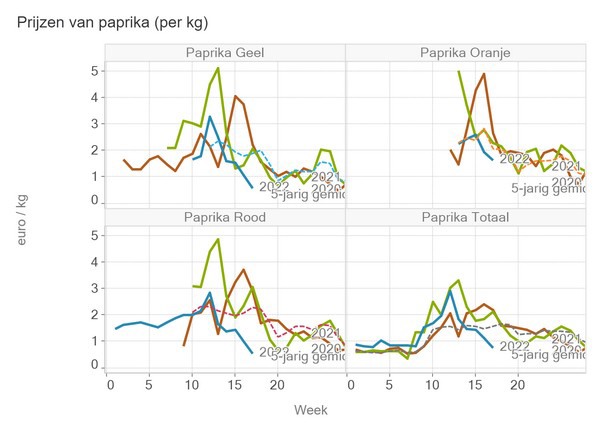 De paprikaprijzen houden ook niet over. Waar in week 16 de prijs voor groene paprika's nog steeg, daalden in week 17 over de hele linie de prijzen. Met net geen 1,16 euro levert een kilo groene paprika's nog steeds wel het meest op. Geen en rood gingen vorige week weg voor kiloprijzen van net iets meer dan 50 eurocent. Een halvering van de prijs ten opzichte van week 16.