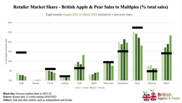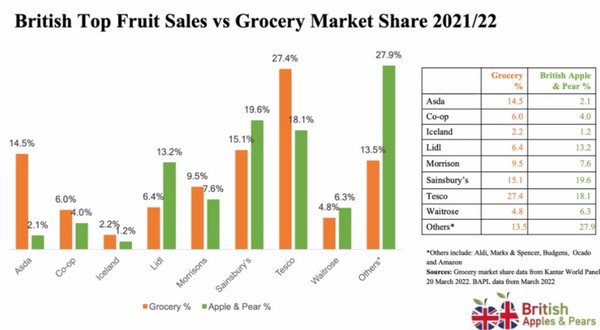 Retailers leveren goed werk als het aankomt op de inkoop van Britse appelen, waarbij Lidl en Sainsbury als beste uit de bus komen. In de kolom 'overige' is Aldi de grootste, naast Marks & Spencer. Asda en Tesco zouden beter hun best kunnen doen.