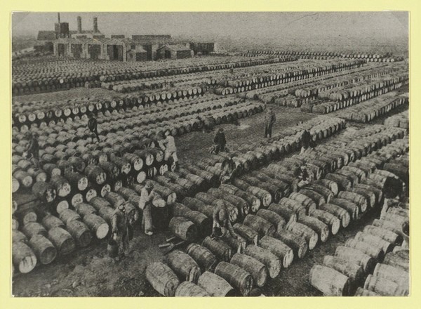 De conservenfabriek van Blad en van der Vijver N.V. in 1918. Hier werden zuurkool, uien, bonen, augurken, bloemkool, snijbonen etc. geconserveerd (ingemaakt) veelal voor de export. Hier liggen naar schatting ongeveer 25.000 vaten opgeslagen. De regeling was toen dat van elke 100 vaten er 20 moesten worden gebruikt in eigen land.