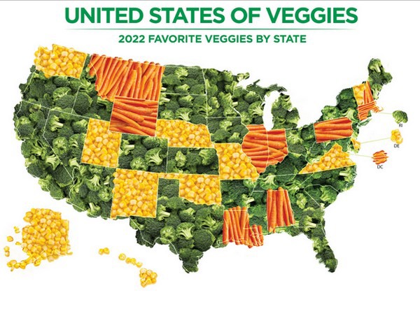 - Broccoli wint (opnieuw) aan populariteit: Broccoli is de favoriete groente in 29 staten. Daarna volgen maïs, wortelen, aardappelen en asperges (in volgorde van populariteit).