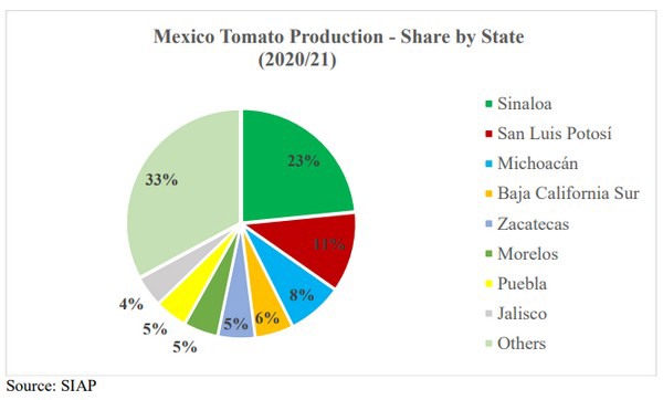 In Mexico worden jaarrond tomaten geteeld, waarbij de twee voornaamste oogstpieken elkaar overlappen. Van december tot april zijn de tomaten afkomstig uit de staat Sinaloa. Deze staat geldt als het grootste tomatenteeltgebied in Mexico en domineert de binnenlandse markt en de export naar de VS. Van mei tot november zijn San Luis Potosi, Michoacan, Baja California Sur, Zacatecas, Morelos, Pueble en Jalisco de voornaamste leveranciers van tomaten.