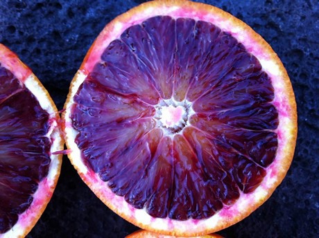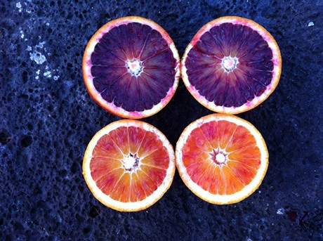 Vergelijking tussen de pigmentatie van Tarocco Vigo (boven) en Tarocco Comune (foto van half januari)